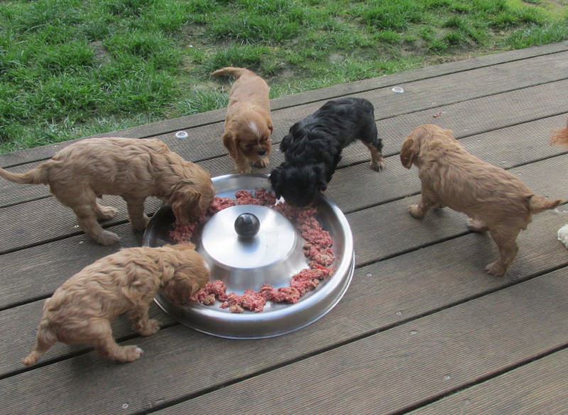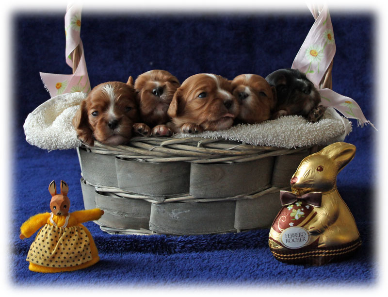Mit 3 Wochen sind die J-chen ziemoich mobil und verlassen nun auch schon die Wurfkiste. Auch dürfen nun die anderen Cavaliere mal mit rein, um sie zu beschnuppern und zu putzen.